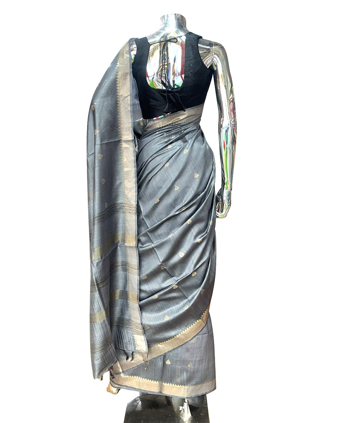 Crafted for modern elegance, this sophisticated grey saree features a smooth silk-like texture enhanced with subtle golden motifs and a finely detailed border. The understated sheen adds a refined touch, making it perfect for festive occasions, formal gatherings, and evening events. Its lightweight fabric ensures effortless draping and all-day comfort, while the minimal yet elegant design offers a timeless appeal. A perfect blend of contemporary style and traditional charm, this saree is ideal for women who appreciate understated luxury.
